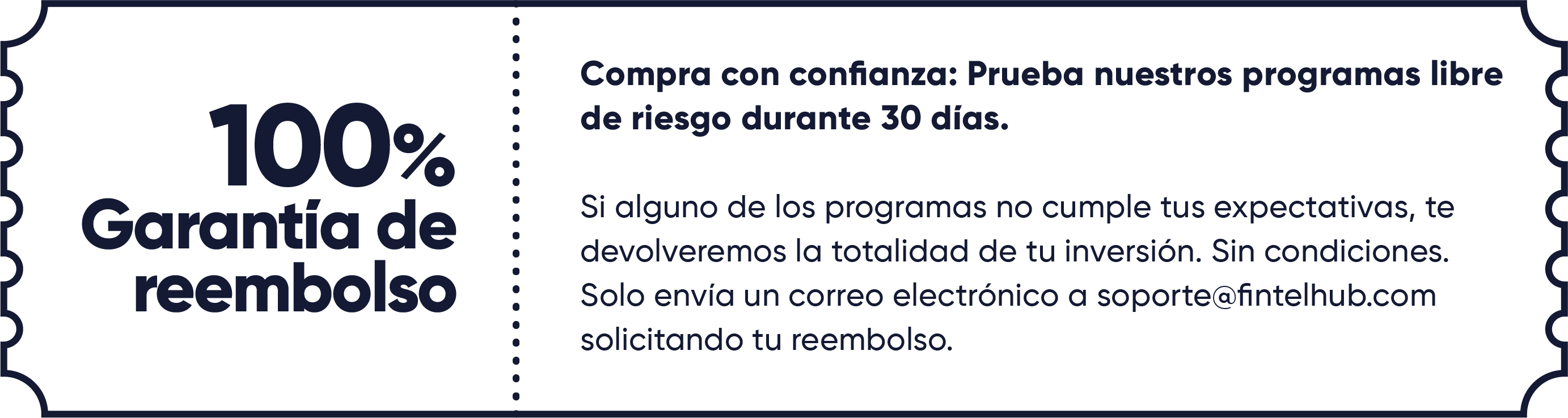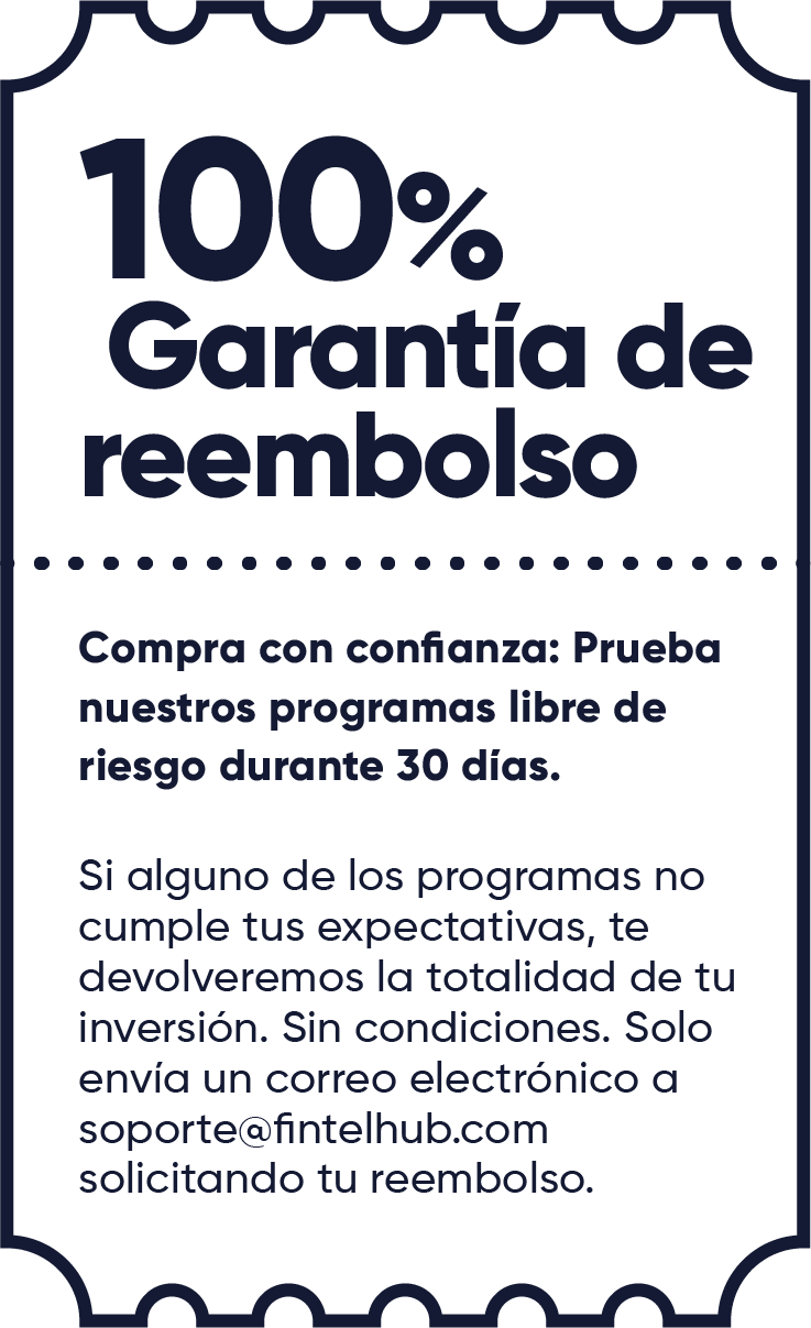 Tienes 30 días de garantía a partir de tu compra para solicitar un reembolso si sientes que el programa no está cumpliendo con tus expectativas. Simplemente nos escribes a soporte@fintelhub.com y con gusto te reintegramos el dinero.